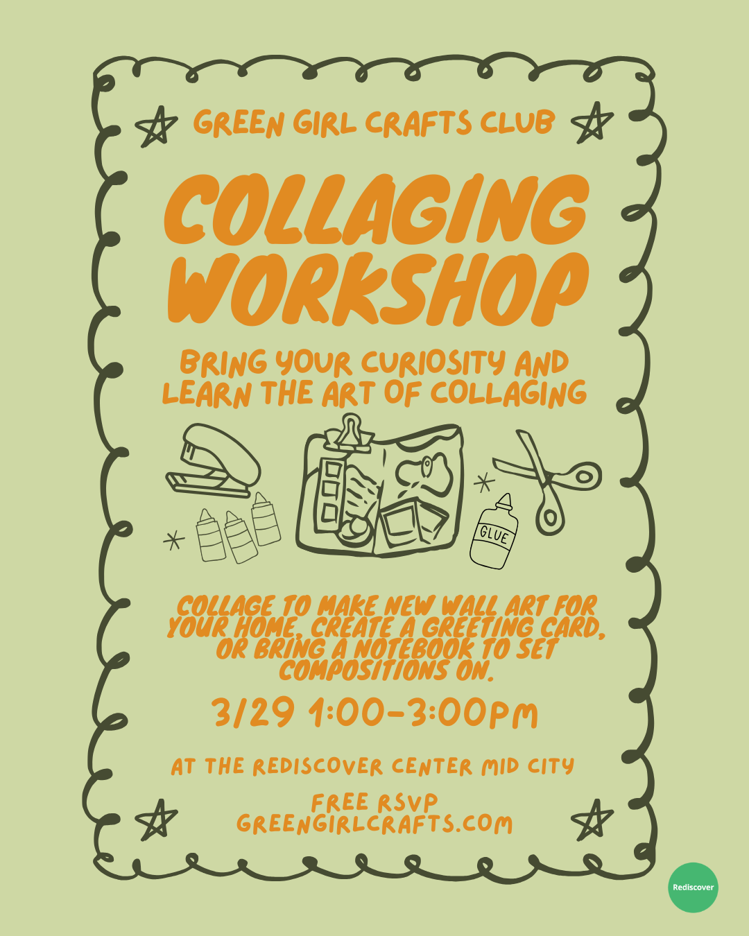 Explore Rediscover Center's shelves of stickers, magazines, papers, and other treasured upcycled materials at our FREE Artist Workshop Sunday, 3/29. Collage to make new wall art for your home, create a greeting card, or bring a notebook to set compositions on.